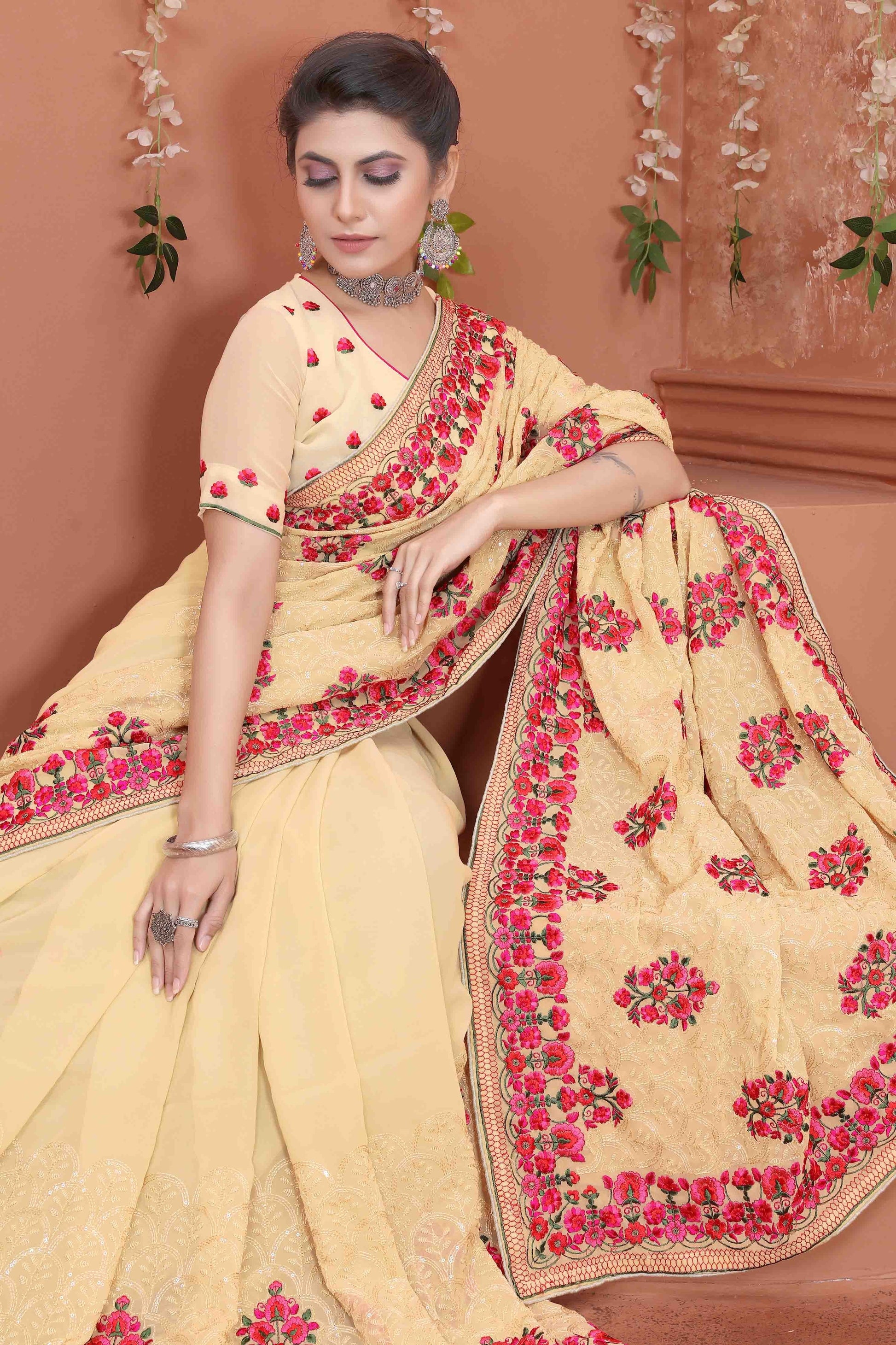 Drape yourself in timeless elegance with this saree crafted and enhanced with Georgette. Available in beautiful shades of Beige, it is perfect for weddings, festive occasions, and parties. Pair it with statement jewellery for a complete traditional look.