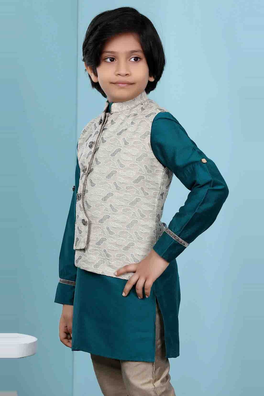 Keep it traditional with this kids boys’ wear enhanced with Handloom Silk. Offered in smart Beige, it’s perfect for family gatherings, festivals, and cultural events.