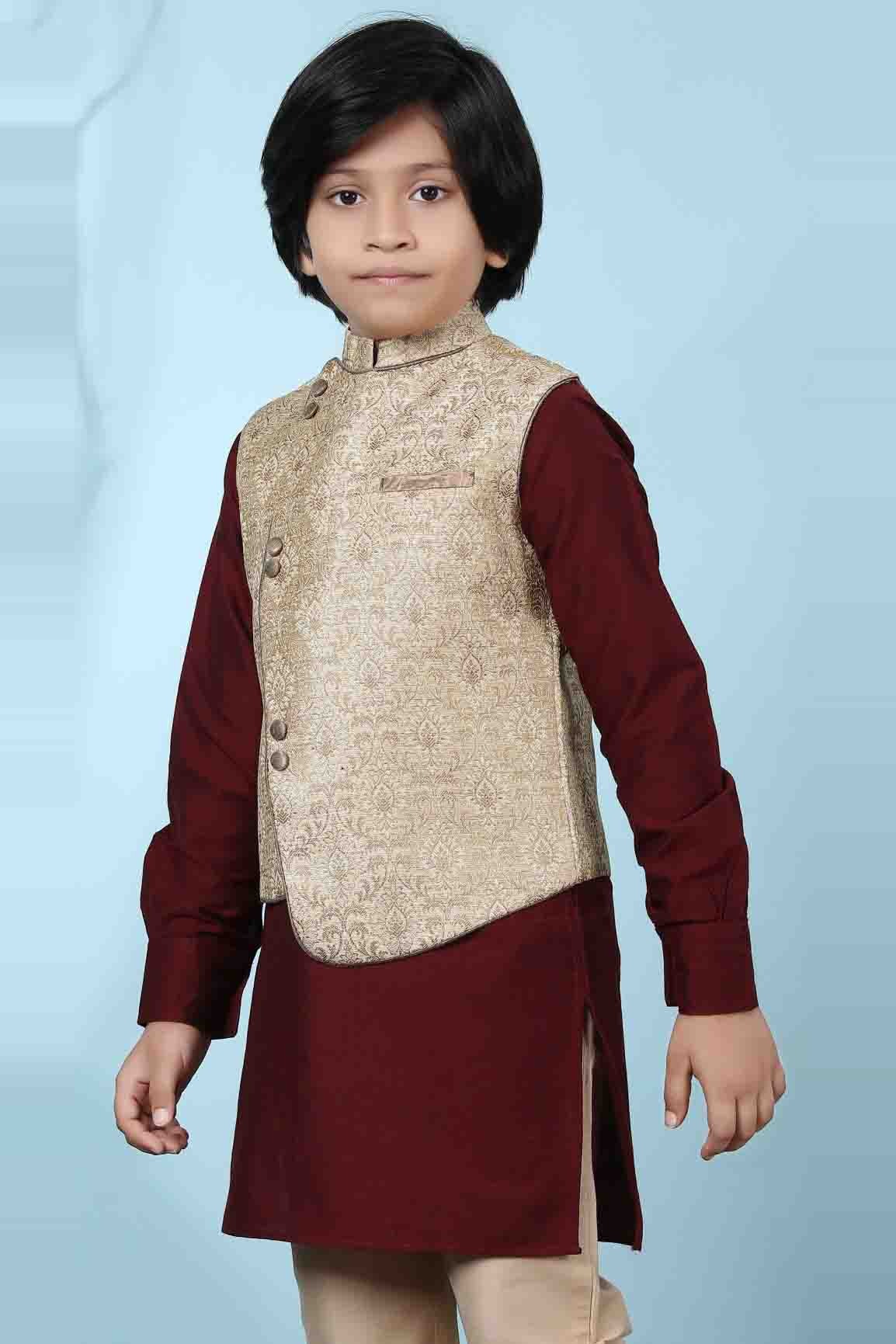 Keep it traditional with this kids boys’ wear enhanced with Jacquard. Offered in smart Beige, it’s perfect for family gatherings, festivals, and cultural events.
