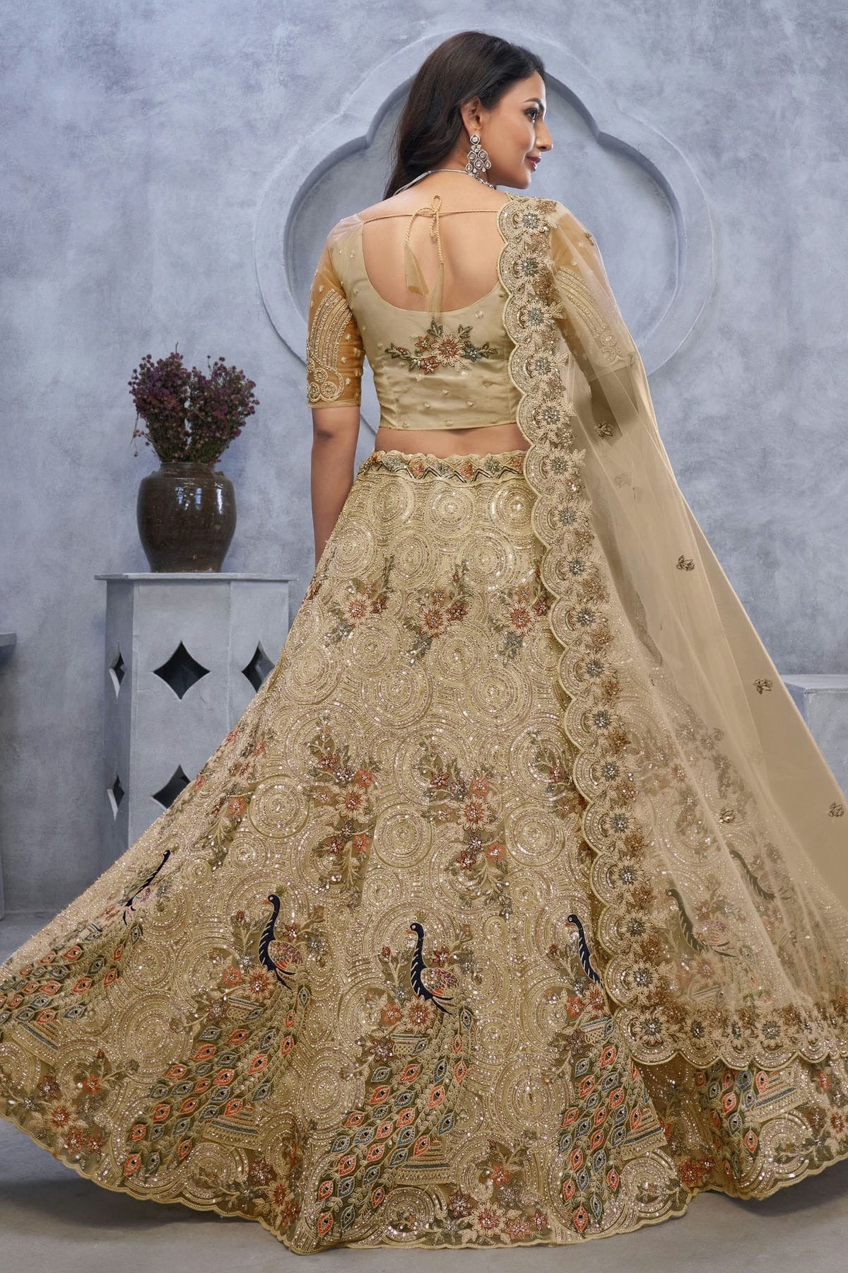 Turn heads in this stunning lehenga choli made with Soft Net. Available in elegant Beige, the set includes a lehenga, blouse, and dupatta. Perfect for weddings, receptions, and grand occasions.
