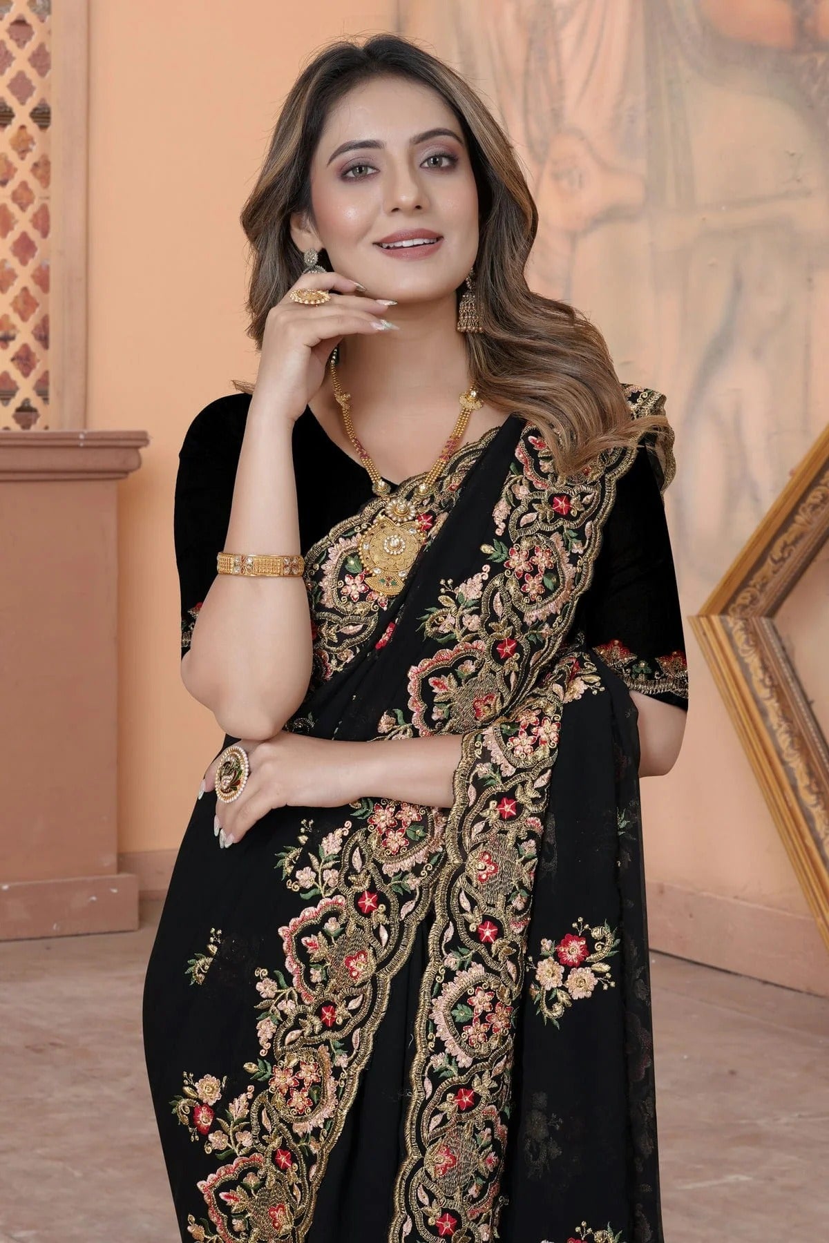 Drape yourself in timeless elegance with this saree crafted and enhanced with Georgette. Available in beautiful shades of Black, it is perfect for weddings, festive occasions, and parties. Pair it with statement jewellery for a complete traditional look.