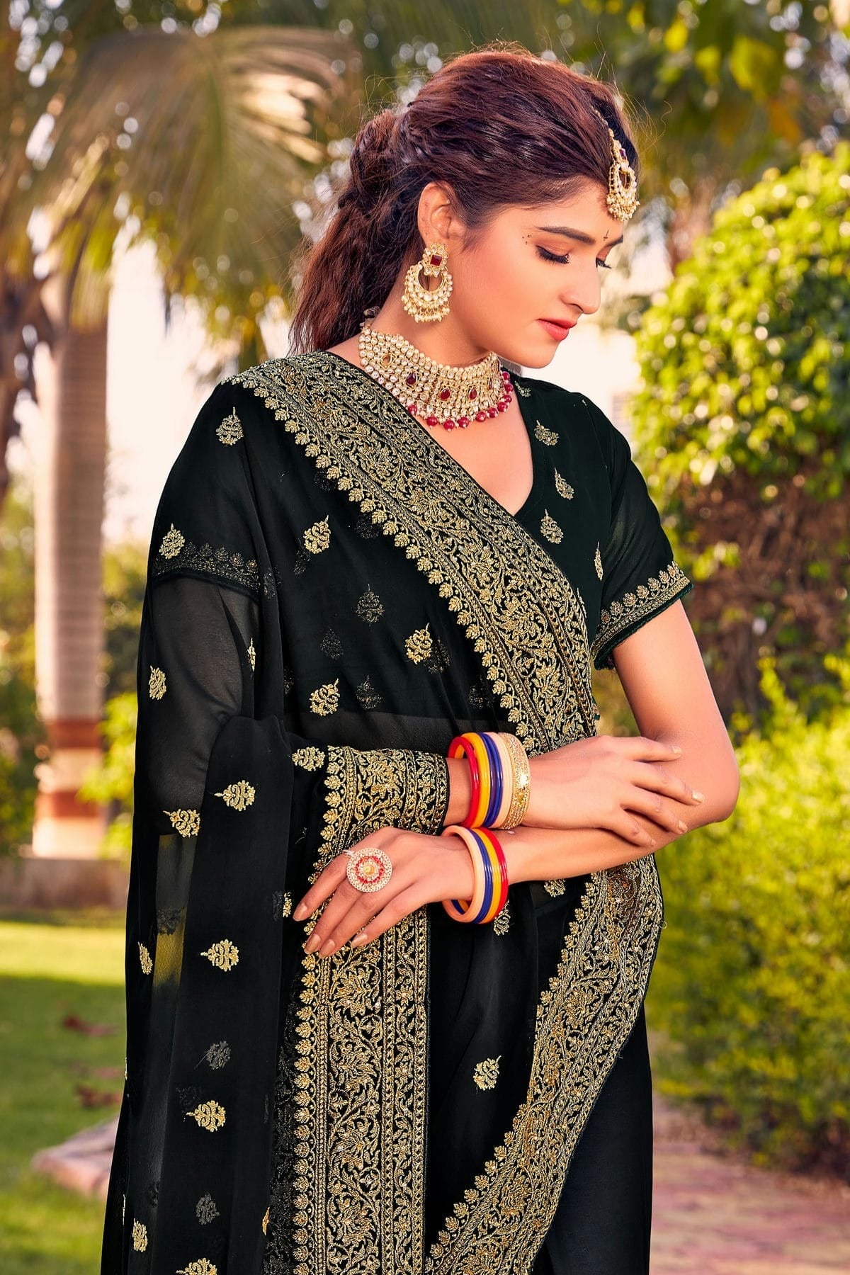 Drape yourself in timeless elegance with this saree crafted and enhanced with Georgette. Available in beautiful shades of Black, it is perfect for weddings, festive occasions, and parties. Pair it with statement jewellery for a complete traditional look.