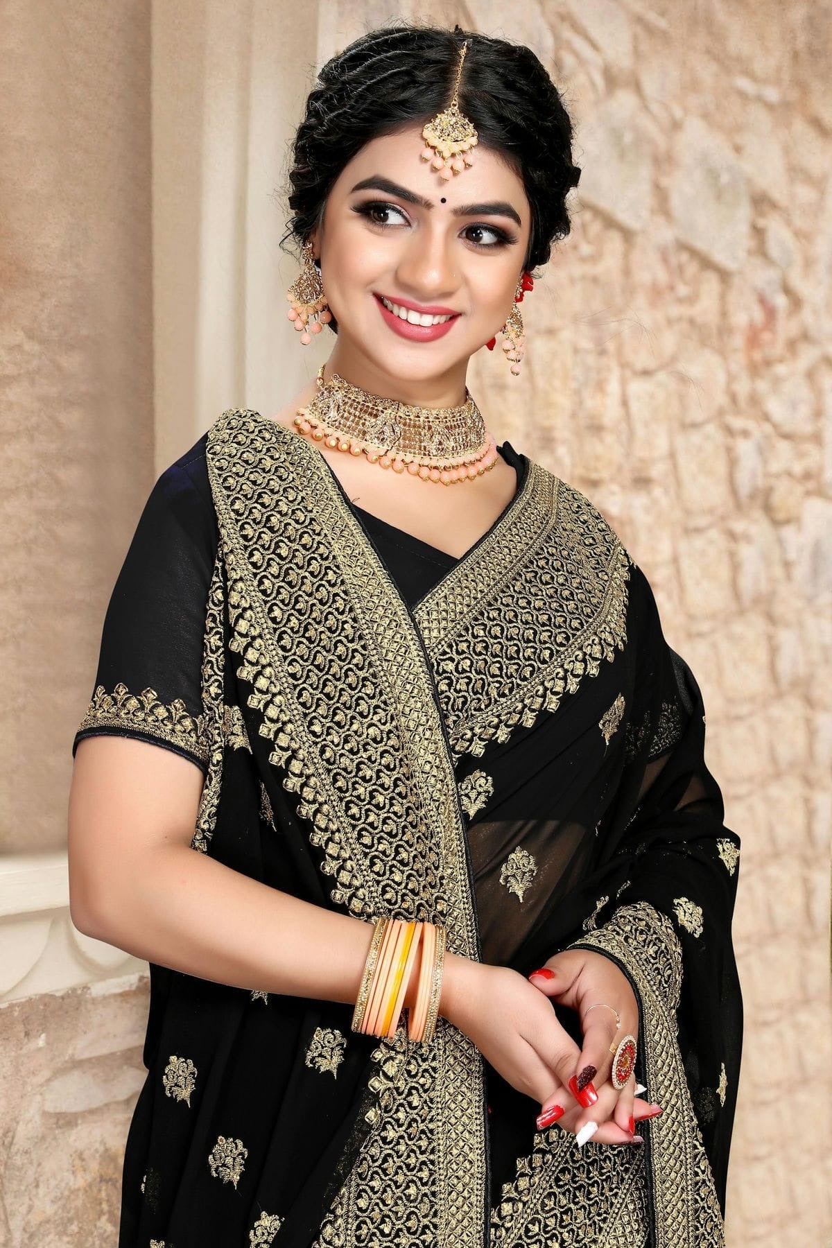 Drape yourself in timeless elegance with this saree crafted and enhanced with Georgette. Available in beautiful shades of Black, it is perfect for weddings, festive occasions, and parties. Pair it with statement jewellery for a complete traditional look.