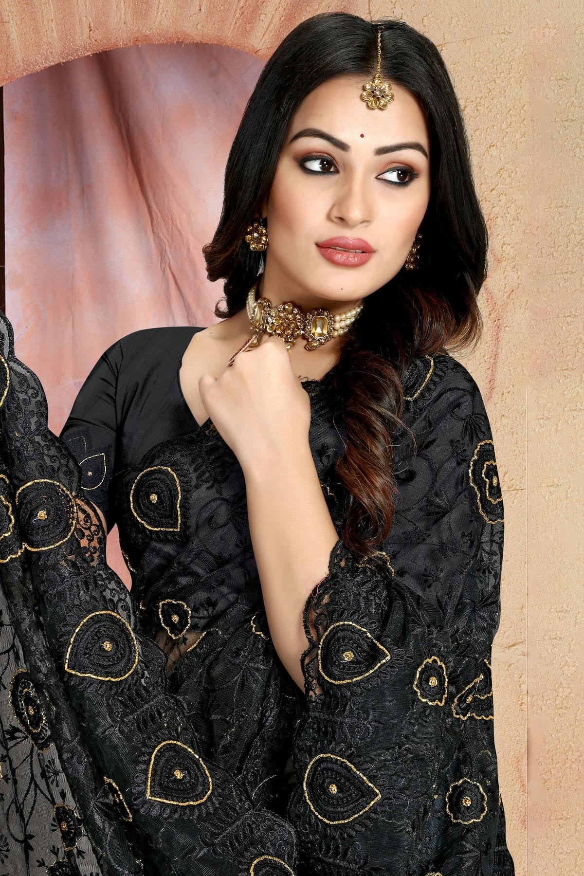 Drape yourself in timeless elegance with this saree crafted and enhanced with Net. Available in beautiful shades of Black, it is perfect for weddings, festive occasions, and parties. Pair it with statement jewellery for a complete traditional look.
