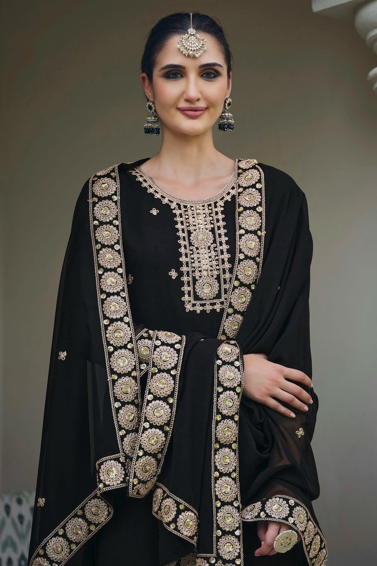 Grace meets comfort in this suit set designed with Georgette. Offered in Black, this set includes a stylish kurta, bottom, and dupatta. Ideal for festive gatherings, weddings, or daily wear.