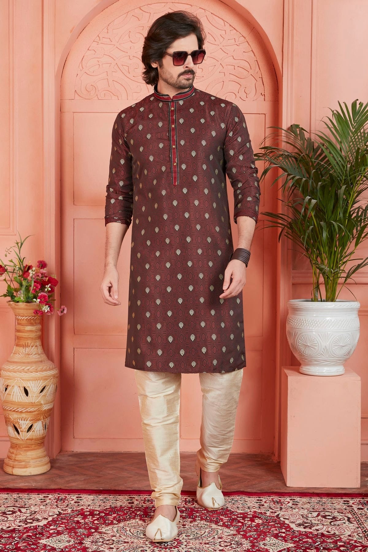 Redefine ethnic style with this mens wear made and decorated with Jacquard Silk Brocade. Available in classy Brown, it’s perfect for weddings, pujas, and festive occasions.