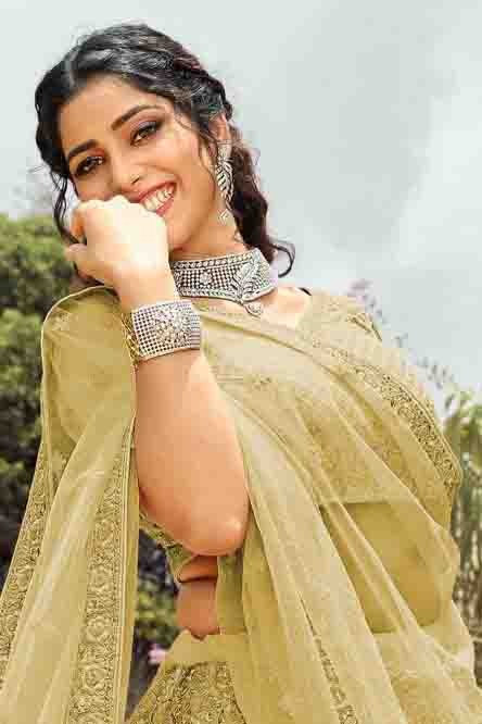 Turn heads in this stunning lehenga choli made with Organza. Available in elegant Cream, the set includes a lehenga, blouse, and dupatta. Perfect for weddings, receptions, and grand occasions.