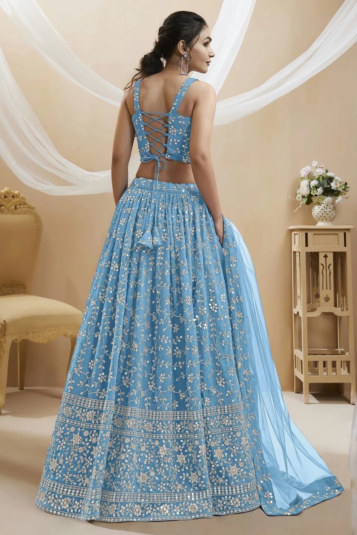Turn heads in this stunning lehenga choli made with Sky Blue. Available in elegant Georgette, the set includes a lehenga, blouse, and dupatta. Perfect for weddings, receptions, and grand occasions.