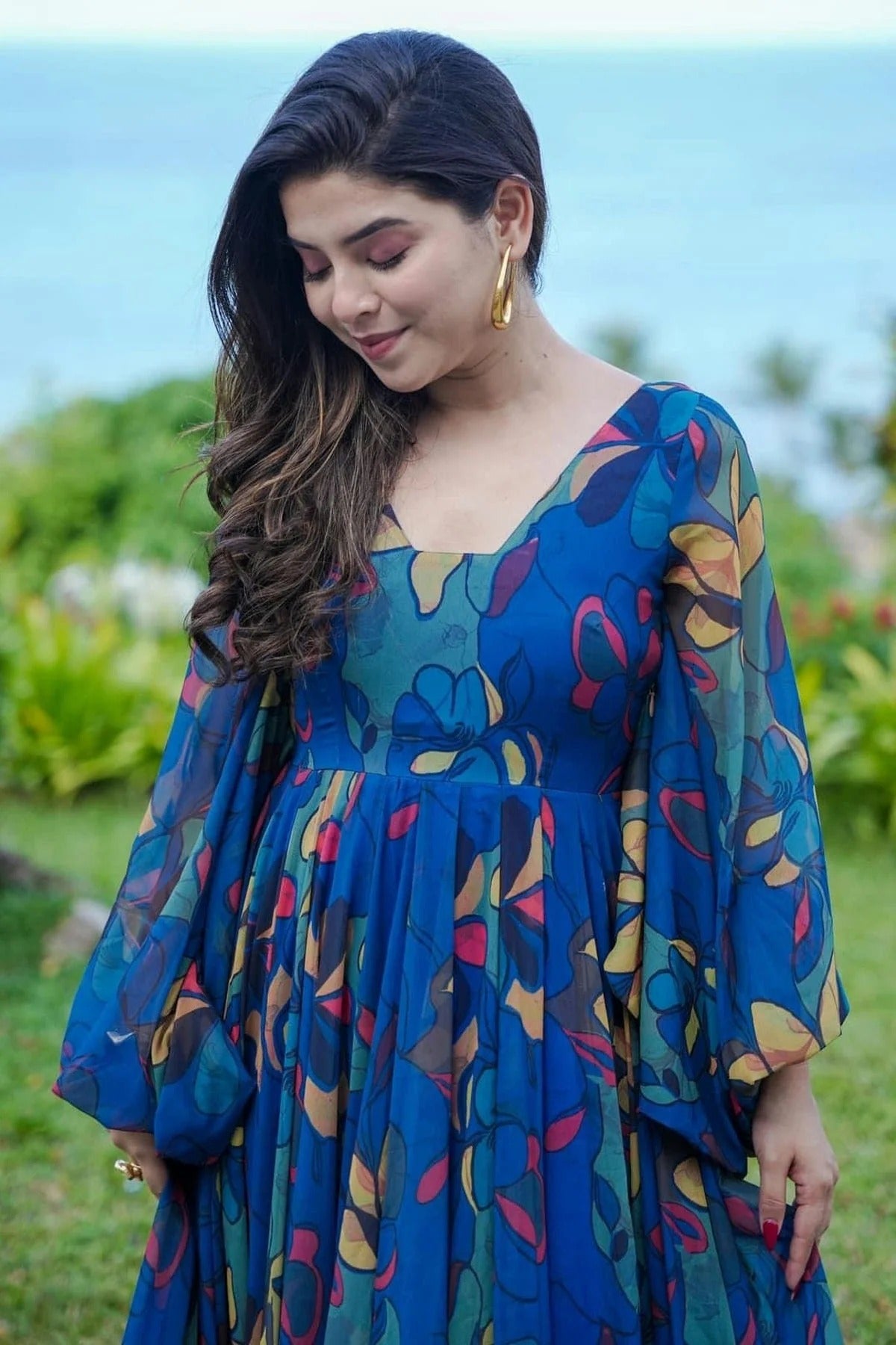 Make a style statement with this gown tailored and detailed with Georgette. Available in Blue, this gown is lightweight, stylish, and perfect for parties, receptions, or festive evenings.