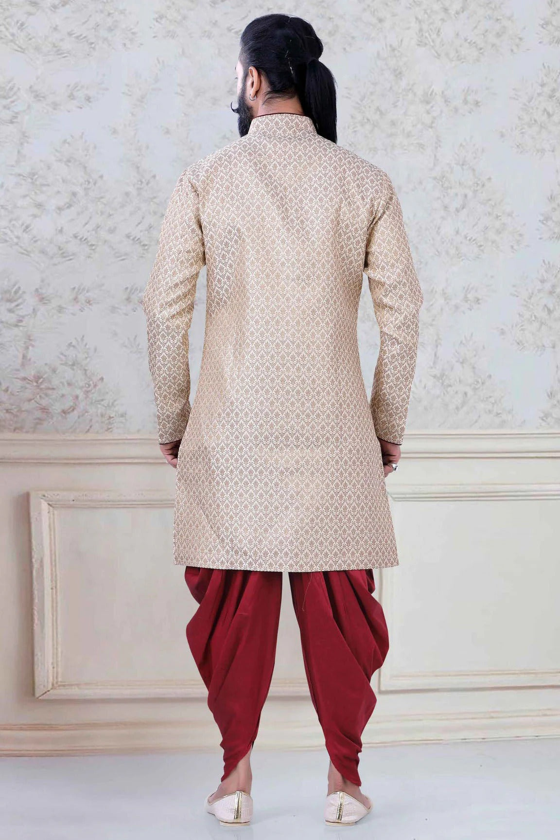 Redefine ethnic style with this mens wear made and decorated with Brocade. Available in classy Gold, it’s perfect for weddings, pujas, and festive occasions.