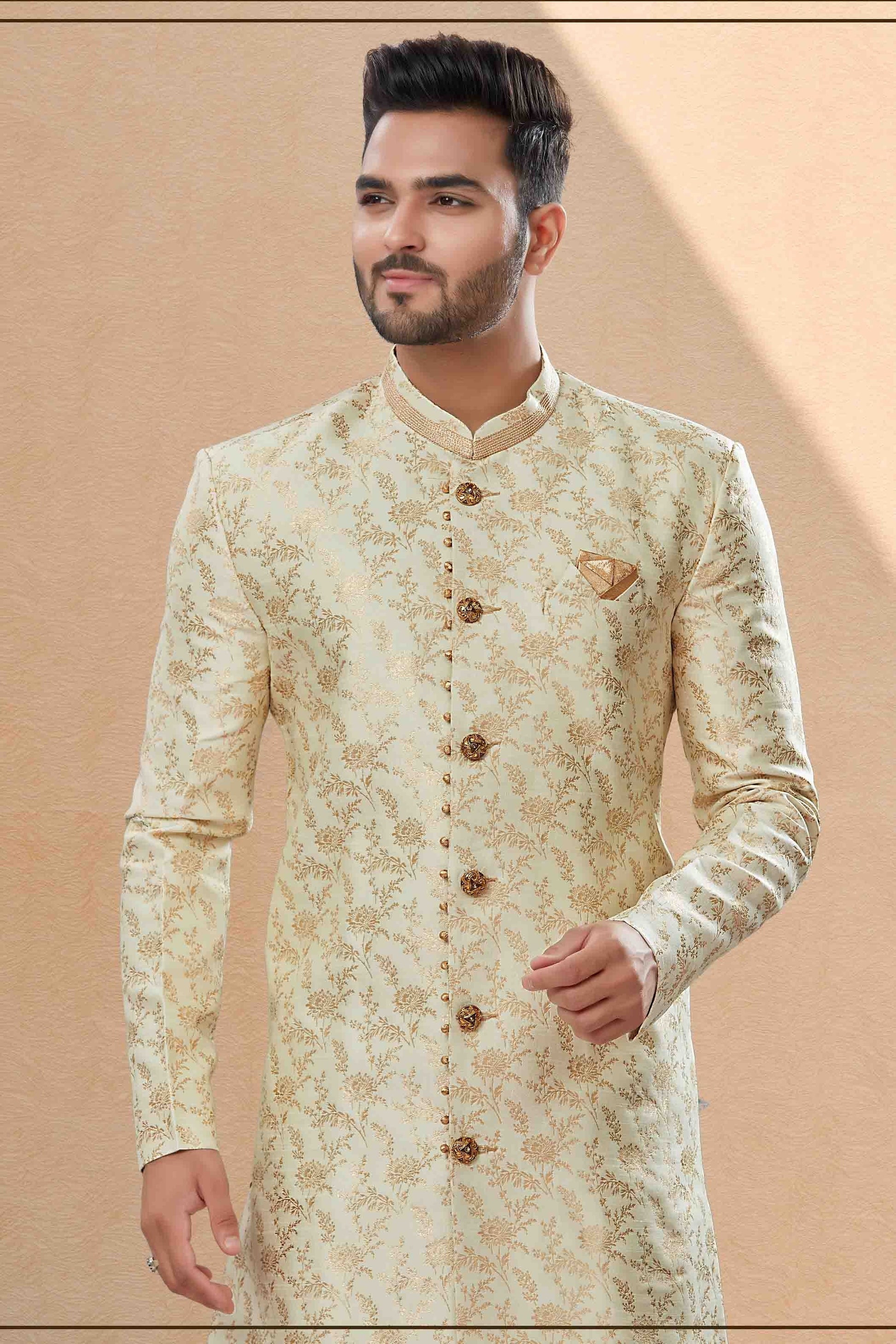 Redefine ethnic style with this mens wear made and decorated with Gold. Available in classy Banarasi Jacquard, it’s perfect for weddings, pujas, and festive occasions.