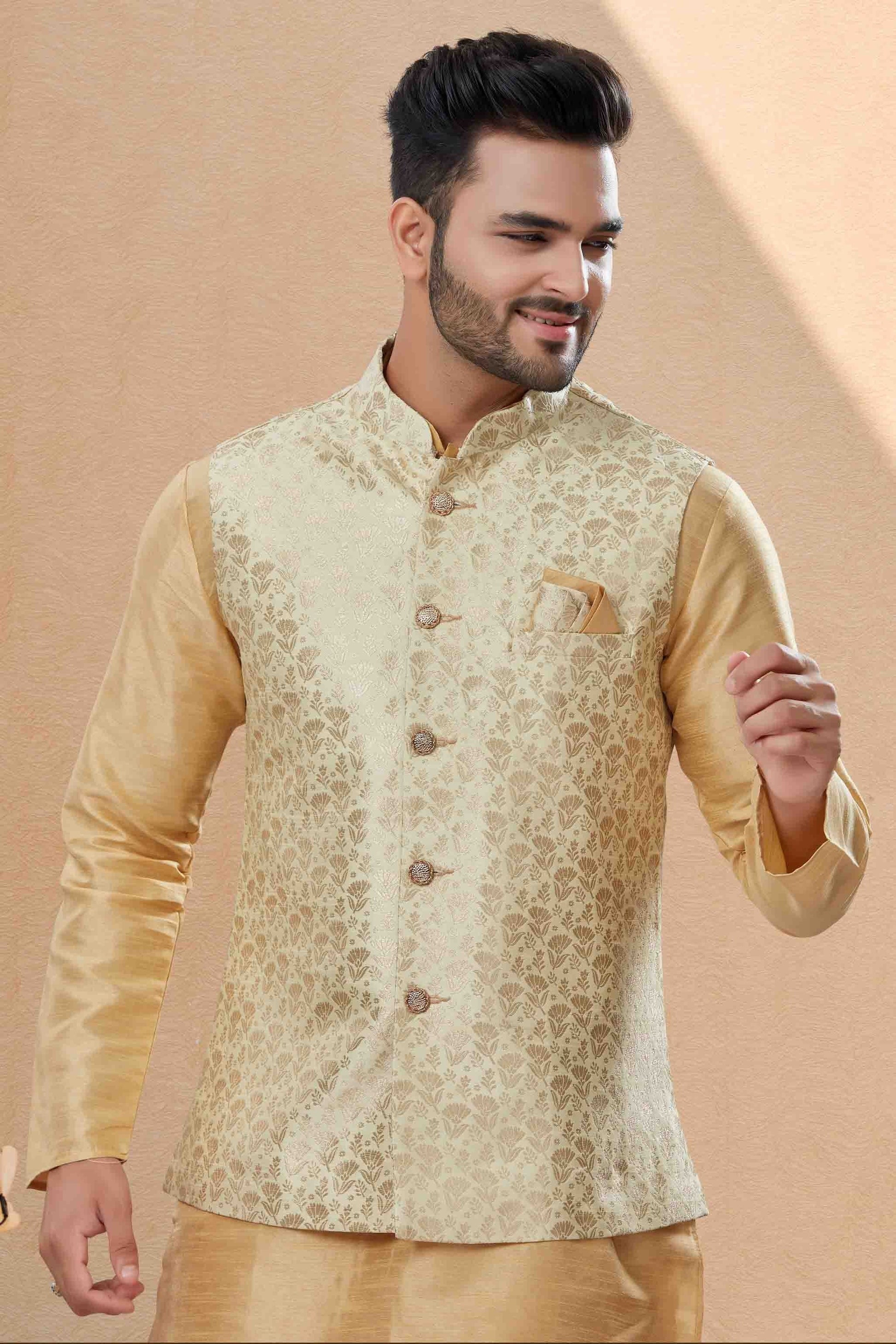 Redefine ethnic style with this mens wear made and decorated with Gold. Available in classy Silk Dupion, it’s perfect for weddings, pujas, and festive occasions.
