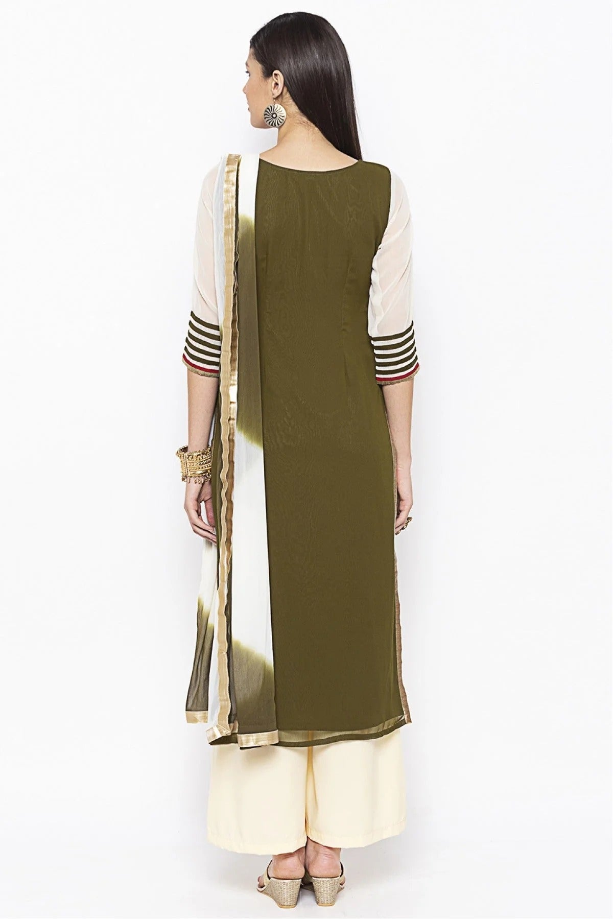 Grace meets comfort in this suit set designed with Green and White. Offered in Georgette, this set includes a stylish kurta, bottom, and dupatta. Ideal for festive gatherings, weddings, or daily wear.