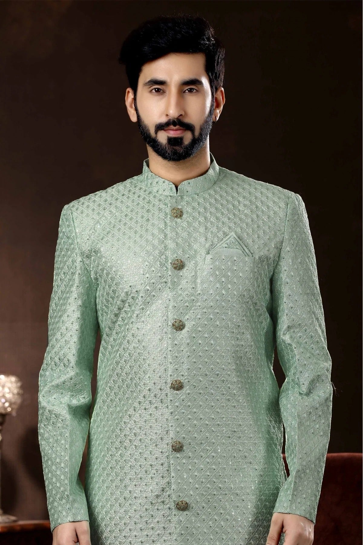 Redefine ethnic style with this mens wear made and decorated with Art Silk. Available in classy Green, it’s perfect for weddings, pujas, and festive occasions.