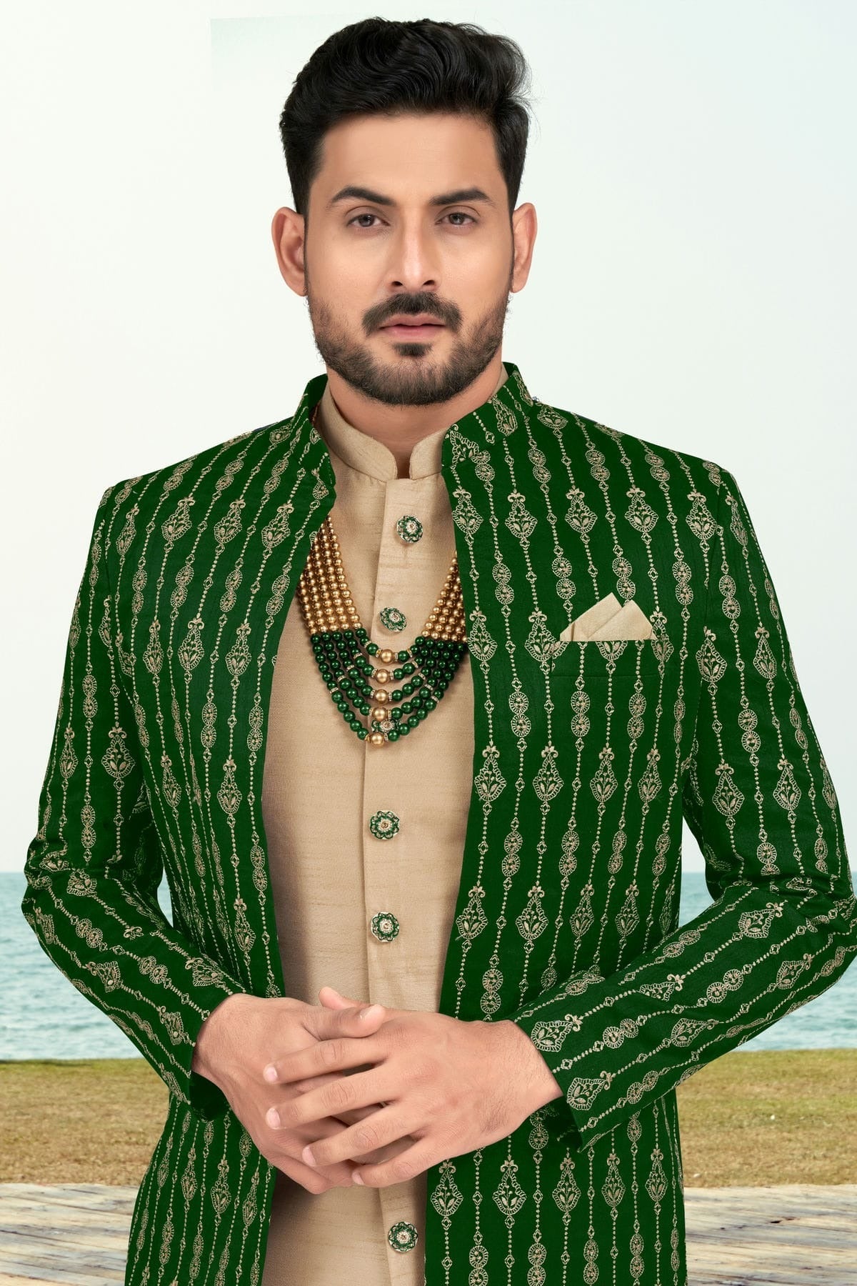 Redefine ethnic style with this mens wear made and decorated with Green. Available in classy 34, it’s perfect for weddings, pujas, and festive occasions.