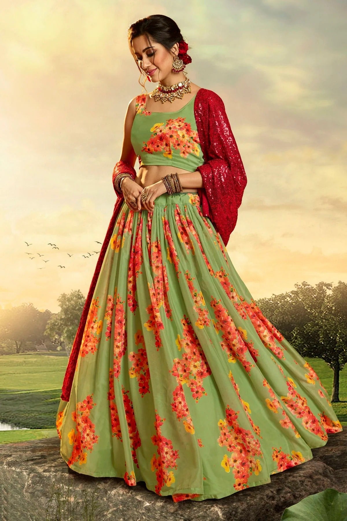 Turn heads in this stunning lehenga choli made with Organza. Available in elegant Green, the set includes a lehenga, blouse, and dupatta. Perfect for weddings, receptions, and grand occasions.