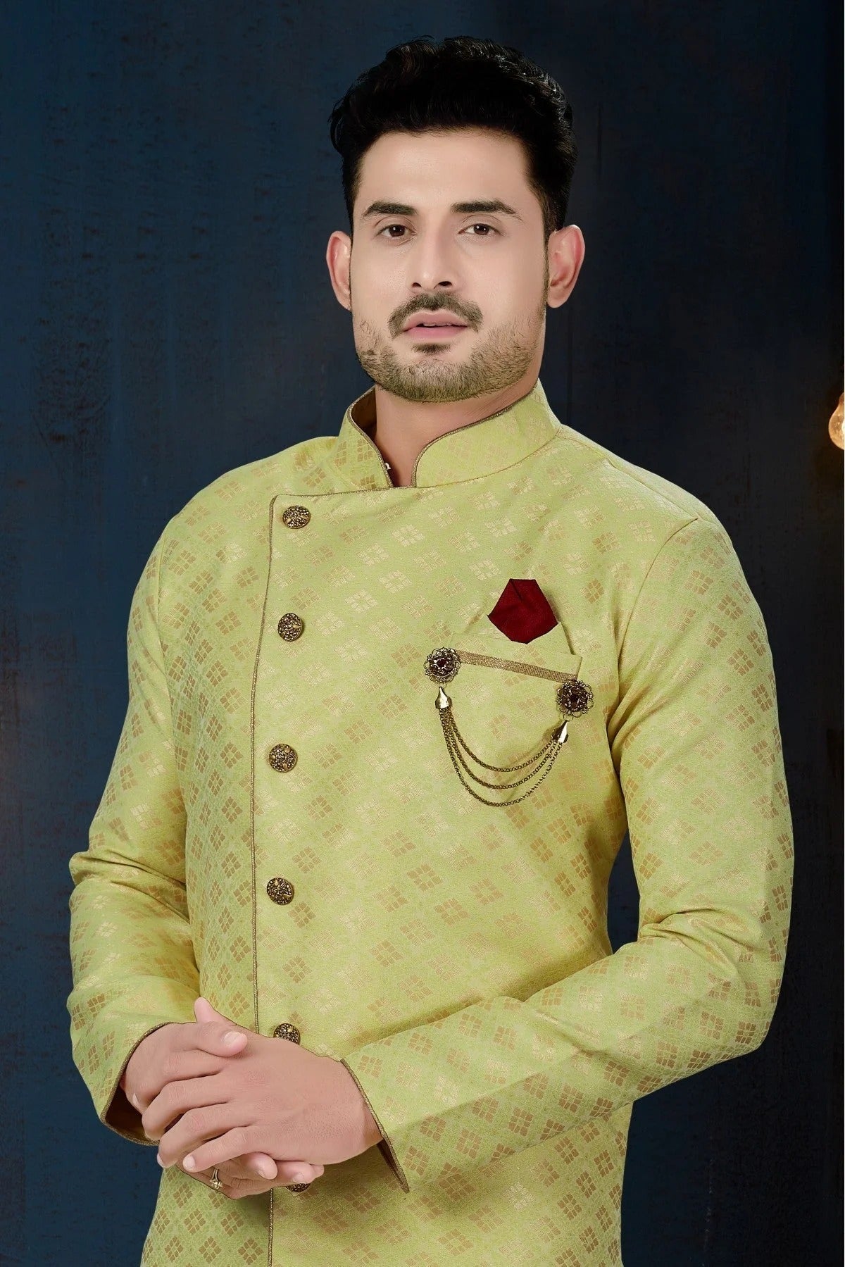 Redefine ethnic style with this mens wear made and decorated with Jacquard. Available in classy Green, it’s perfect for weddings, pujas, and festive occasions.