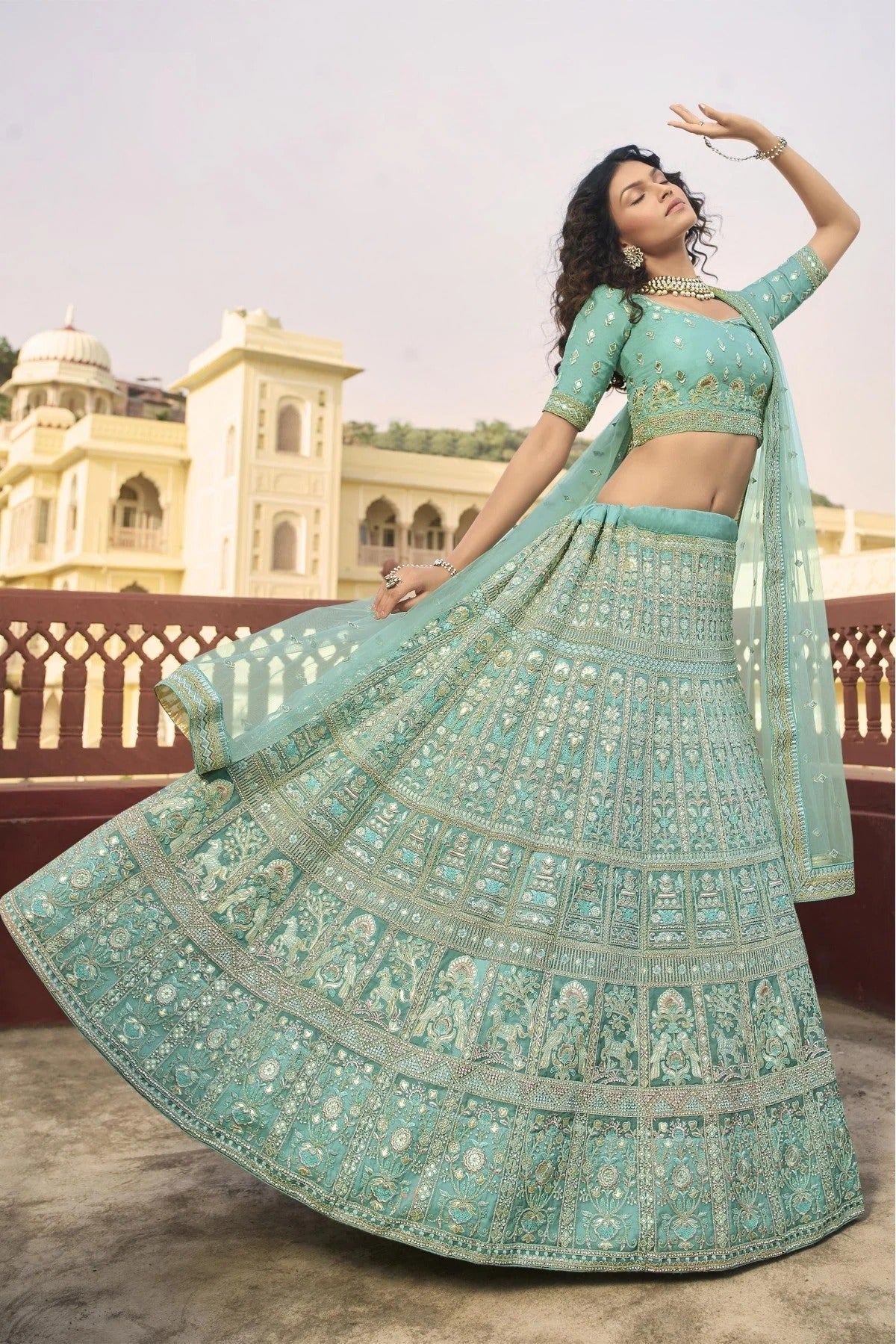 Turn heads in this stunning lehenga choli made with Organza. Available in elegant Green, the set includes a lehenga, blouse, and dupatta. Perfect for weddings, receptions, and grand occasions.