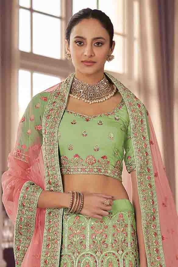 Turn heads in this stunning lehenga choli made with Organza. Available in elegant Green, the set includes a lehenga, blouse, and dupatta. Perfect for weddings, receptions, and grand occasions.