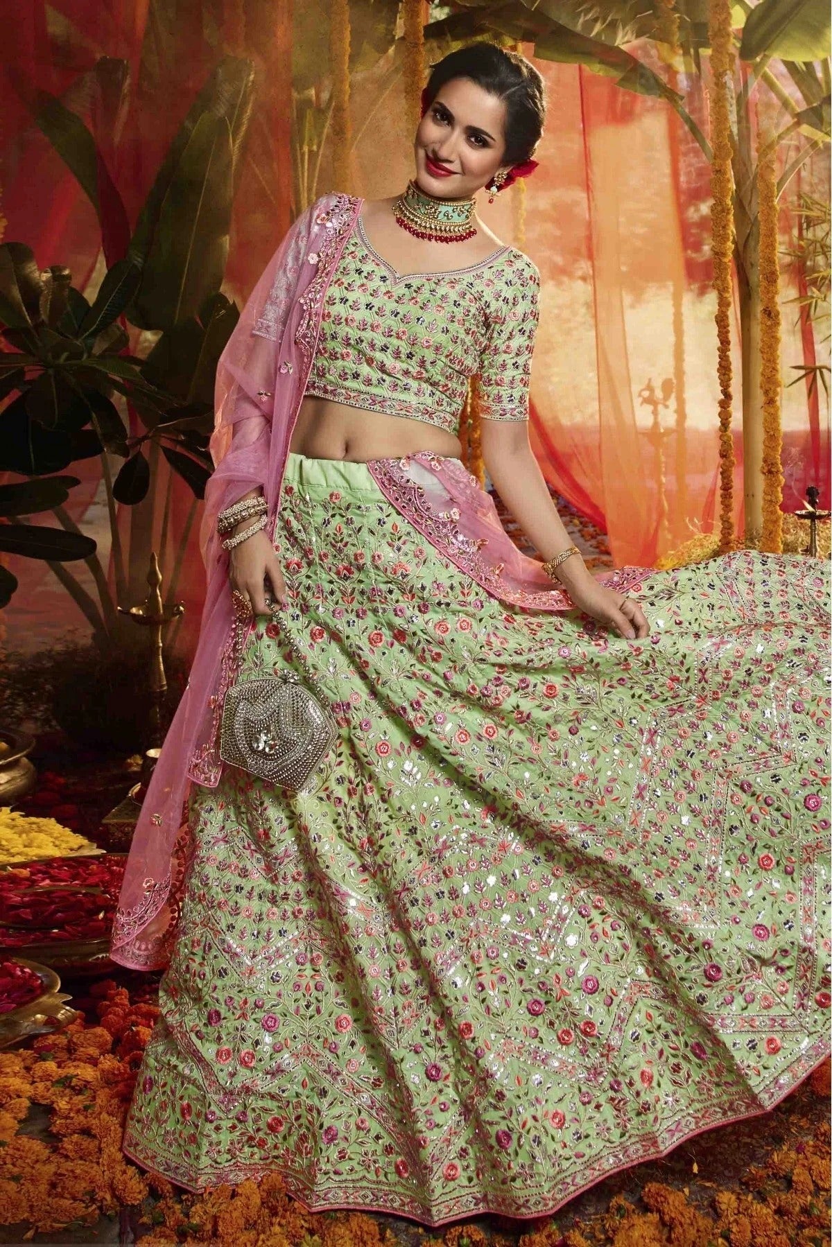 Turn heads in this stunning lehenga choli made with Organza. Available in elegant Green, the set includes a lehenga, blouse, and dupatta. Perfect for weddings, receptions, and grand occasions.