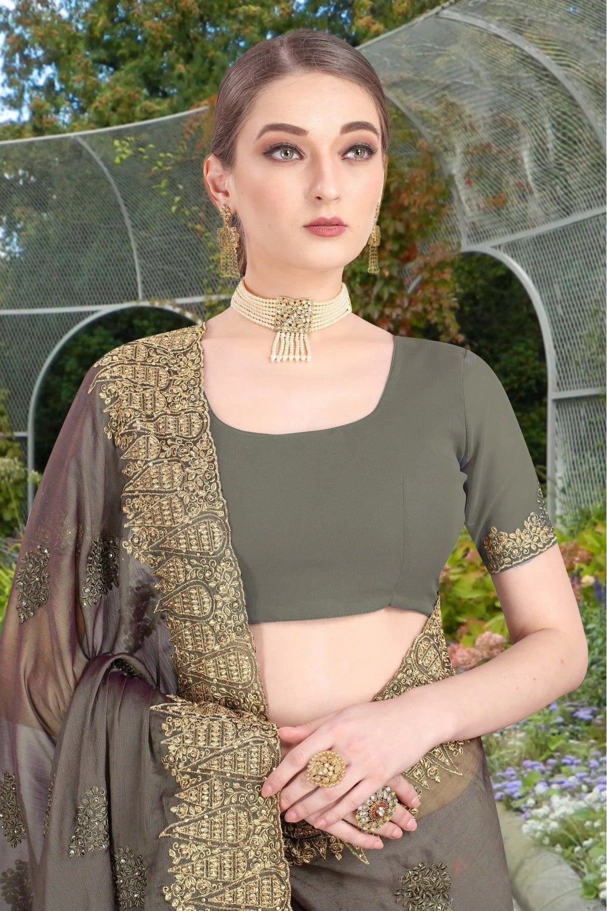 Drape yourself in timeless elegance with this saree crafted and enhanced with Chiffon. Available in beautiful shades of Grey, it is perfect for weddings, festive occasions, and parties. Pair it with statement jewellery for a complete traditional look.