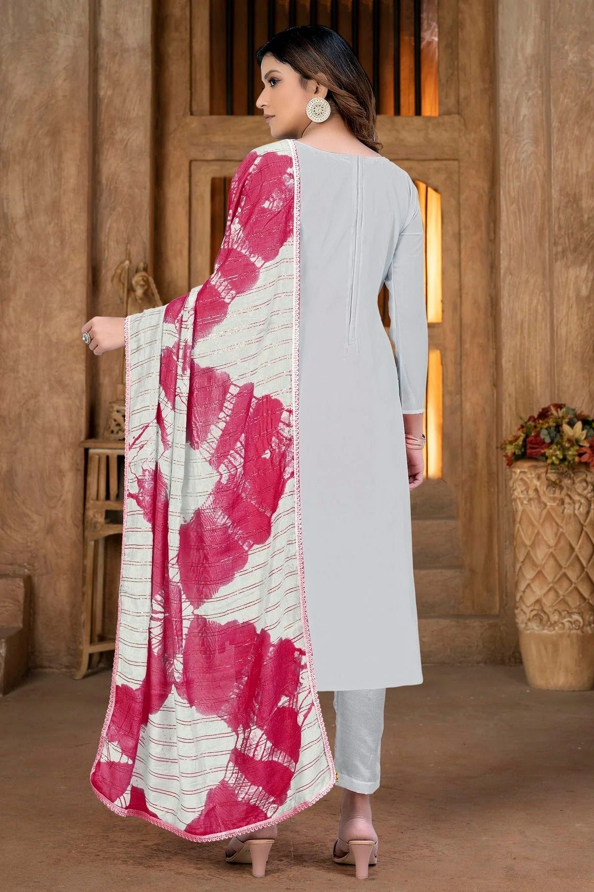 Grace meets comfort in this suit set designed with Georgette. Offered in Grey, this set includes a stylish kurta, bottom, and dupatta. Ideal for festive gatherings, weddings, or daily wear.