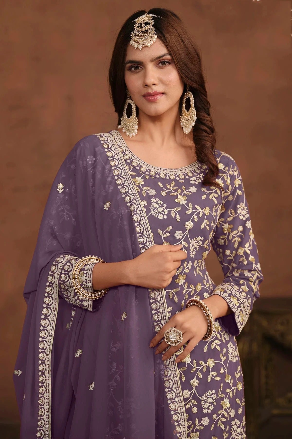 Grace meets comfort in this suit set designed with Faux Georgette. Offered in Lavender, this set includes a stylish kurta, bottom, and dupatta. Ideal for festive gatherings, weddings, or daily wear.