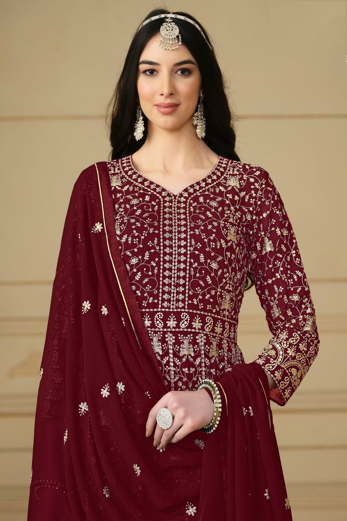 Grace meets comfort in this suit set designed with Faux Georgette. Offered in Maroon, this set includes a stylish kurta, bottom, and dupatta. Ideal for festive gatherings, weddings, or daily wear.