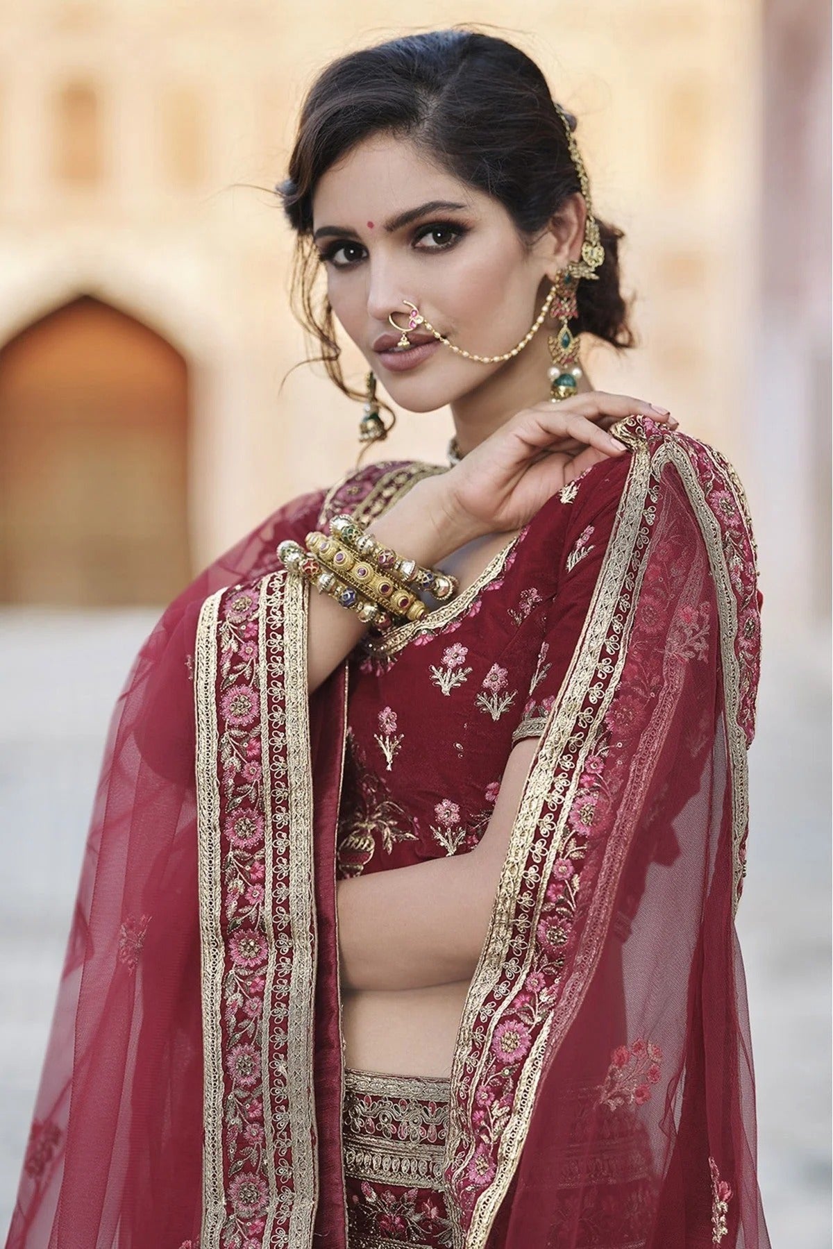 Turn heads in this stunning lehenga choli made with Velvet. Available in elegant Maroon, the set includes a lehenga, blouse, and dupatta. Perfect for weddings, receptions, and grand occasions.
