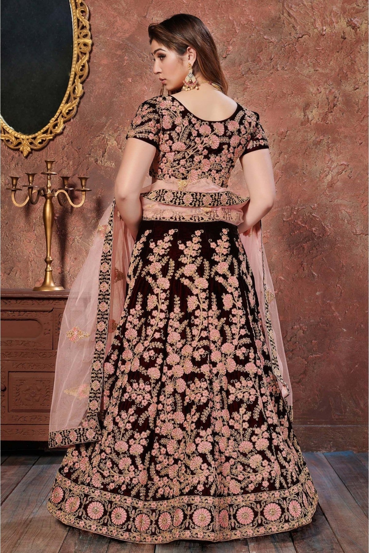 Turn heads in this stunning lehenga choli made with Velvet. Available in elegant Maroon, the set includes a lehenga, blouse, and dupatta. Perfect for weddings, receptions, and grand occasions.