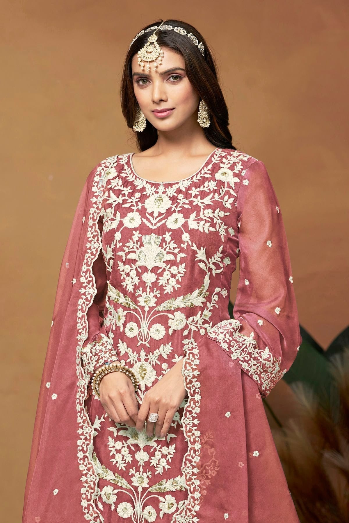 Grace meets comfort in this suit set designed with Soft Organza. Offered in Mauve, this set includes a stylish kurta, bottom, and dupatta. Ideal for festive gatherings, weddings, or daily wear.