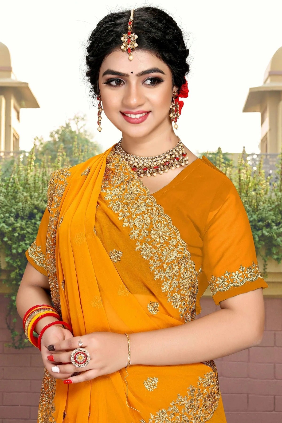 Drape yourself in timeless elegance with this saree crafted and enhanced with Georgette. Available in beautiful shades of Mustard, it is perfect for weddings, festive occasions, and parties. Pair it with statement jewellery for a complete traditional look.