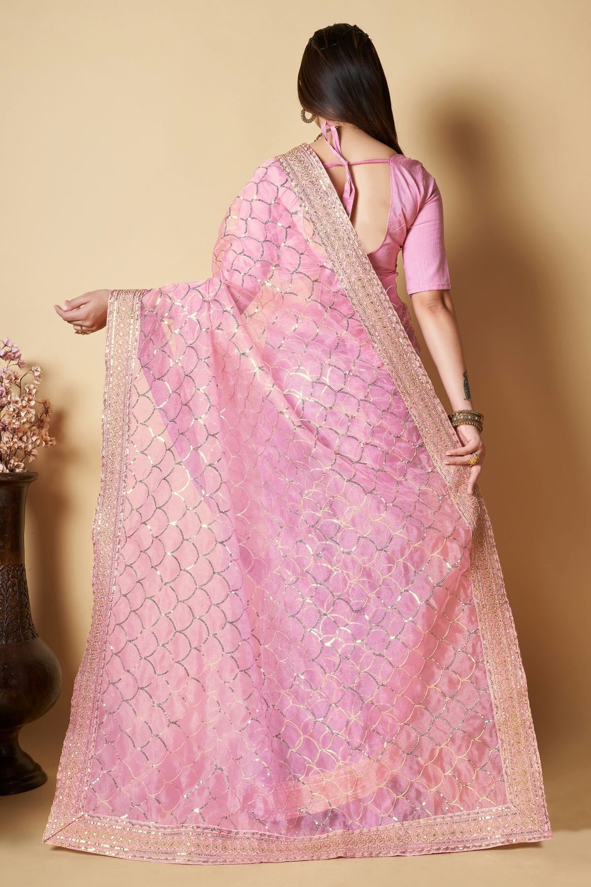 Drape yourself in timeless elegance with this saree crafted and enhanced with Organza. Available in beautiful shades of Pink, it is perfect for weddings, festive occasions, and parties. Pair it with statement jewellery for a complete traditional look.