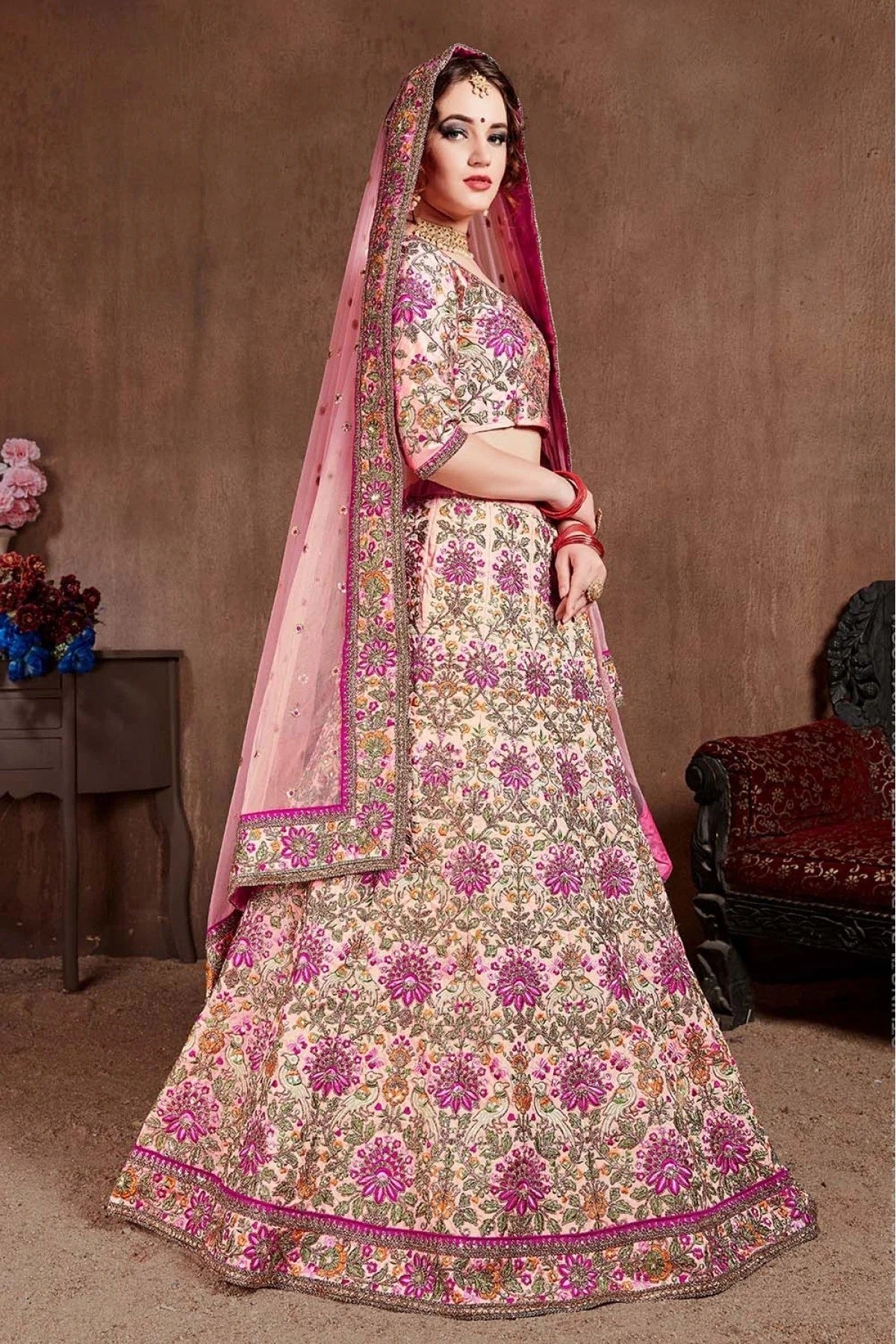 Turn heads in this stunning lehenga choli made with Taffeta Silk. Available in elegant Pink, the set includes a lehenga, blouse, and dupatta. Perfect for weddings, receptions, and grand occasions.
