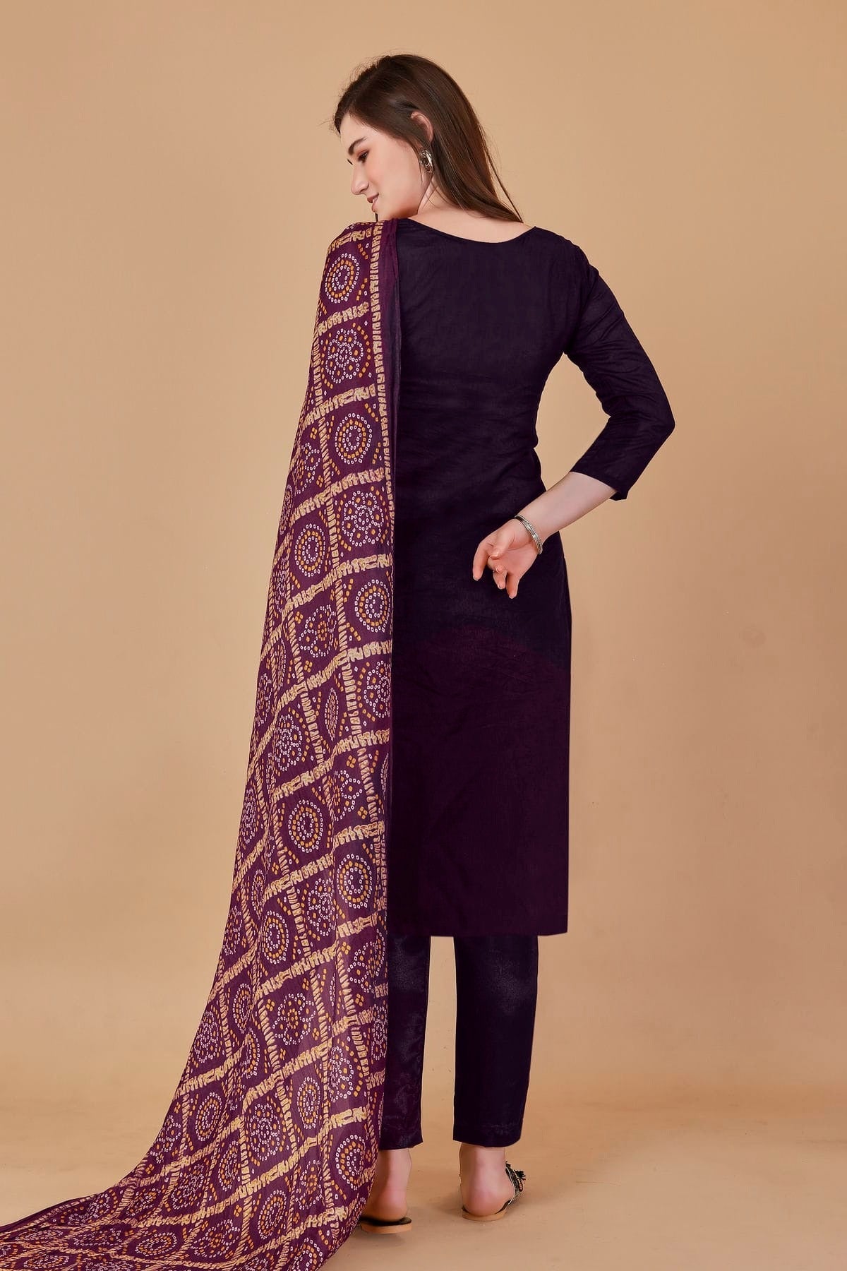 Grace meets comfort in this suit set designed with Banarasi Jacquard. Offered in Purple, this set includes a stylish kurta, bottom, and dupatta. Ideal for festive gatherings, weddings, or daily wear.