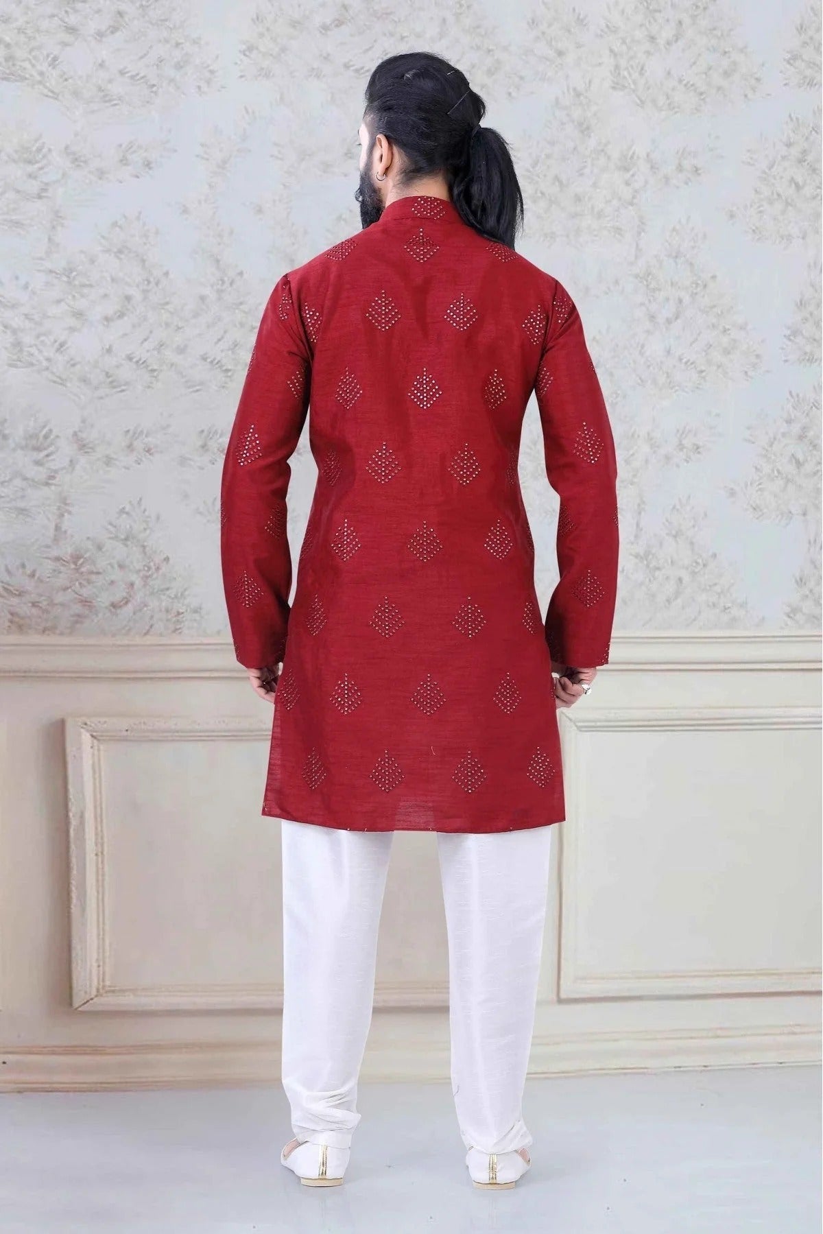Redefine ethnic style with this mens wear made and decorated with Silk. Available in classy Red, it’s perfect for weddings, pujas, and festive occasions.