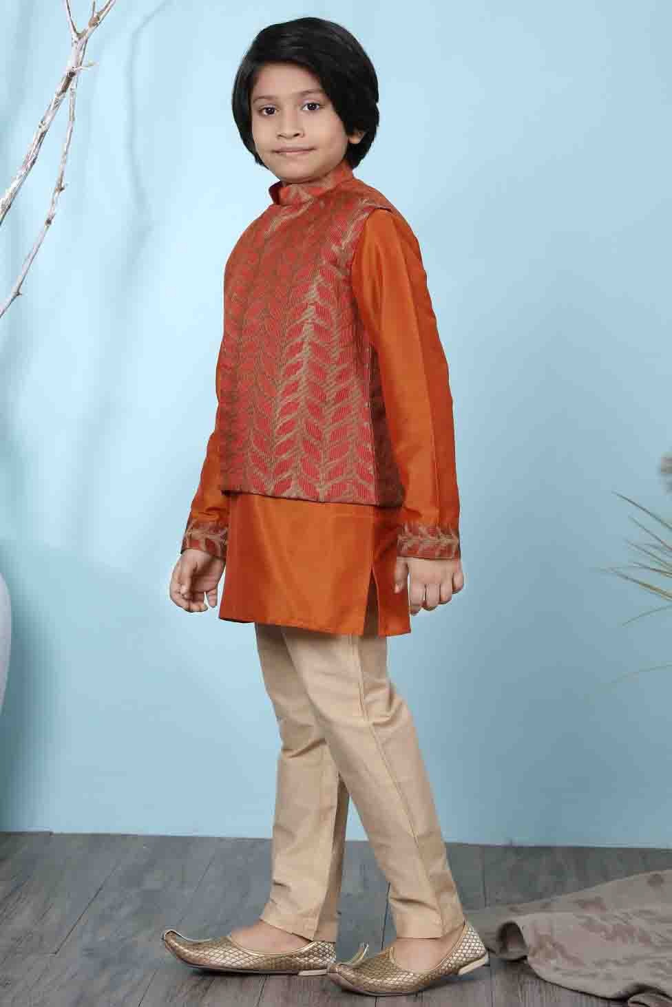 Keep it traditional with this kids boys’ wear enhanced with Cotton Silk. Offered in smart Rust, it’s perfect for family gatherings, festivals, and cultural events.