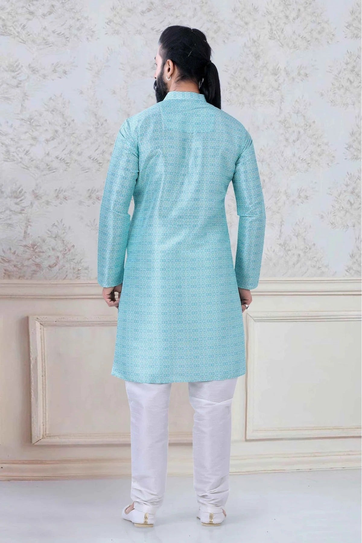 Redefine ethnic style with this mens wear made and decorated with Silk. Available in classy Sky Blue, it’s perfect for weddings, pujas, and festive occasions.