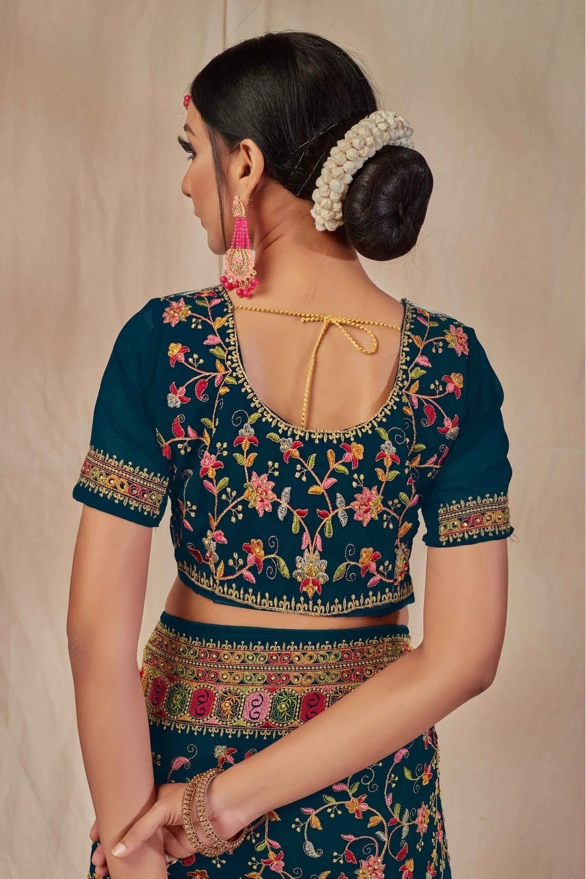 Drape yourself in timeless elegance with this saree crafted and enhanced with Georgette. Available in beautiful shades of Teal and Blue, it is perfect for weddings, festive occasions, and parties. Pair it with statement jewellery for a complete traditional look.