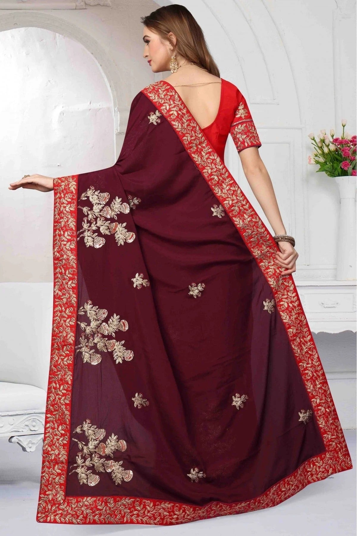 Drape yourself in timeless elegance with this saree crafted and enhanced with Pure Satin. Available in beautiful shades of Wine, it is perfect for weddings, festive occasions, and parties. Pair it with statement jewellery for a complete traditional look.
