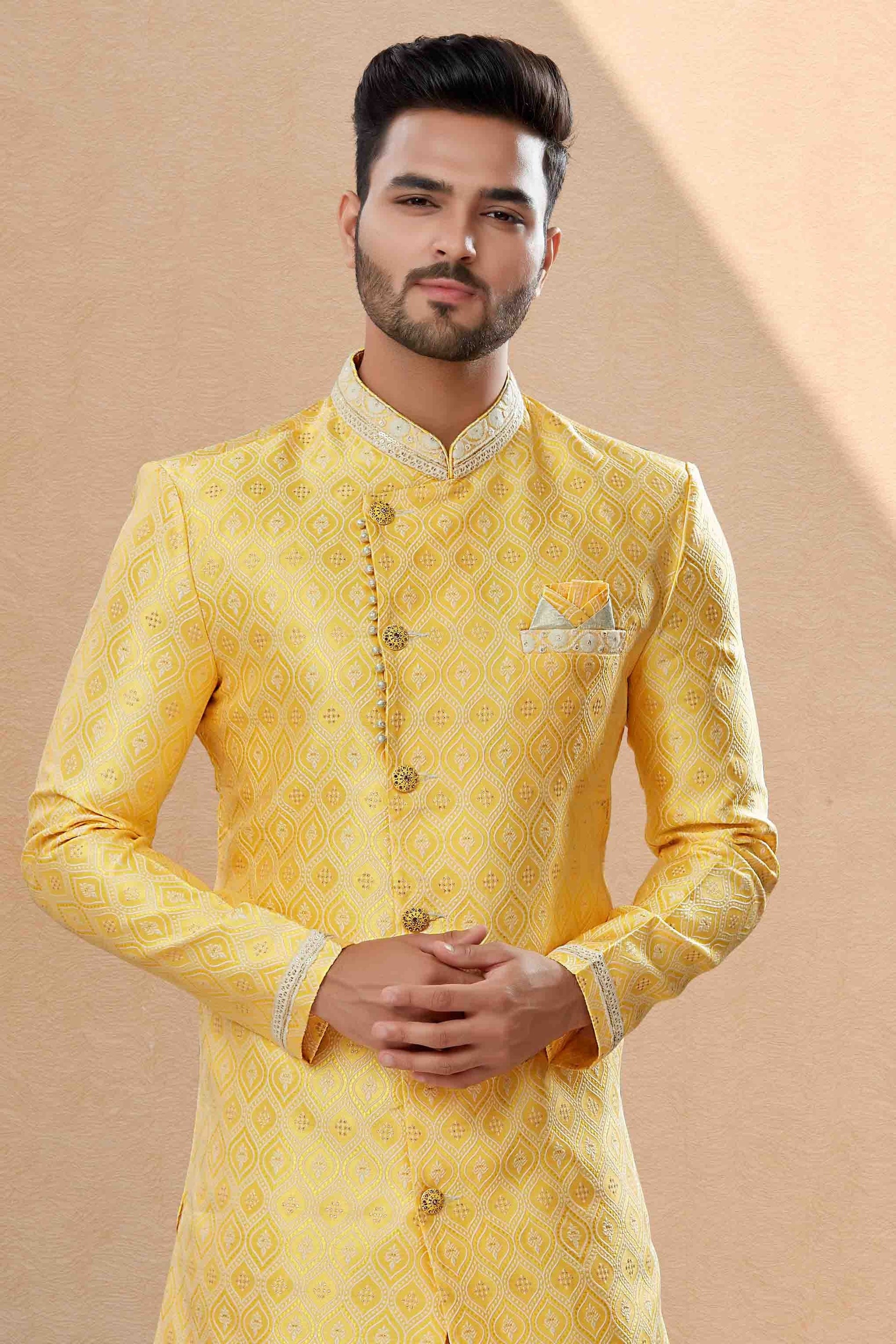Redefine ethnic style with this mens wear made and decorated with Yellow. Available in classy Banarasi Jacquard, it’s perfect for weddings, pujas, and festive occasions.