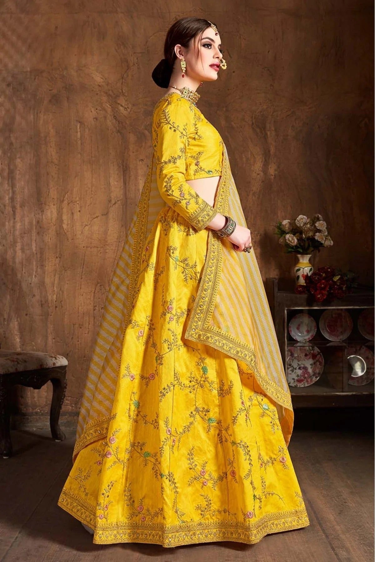 Turn heads in this stunning lehenga choli made with Mulberry Silk. Available in elegant Yellow, the set includes a lehenga, blouse, and dupatta. Perfect for weddings, receptions, and grand occasions.